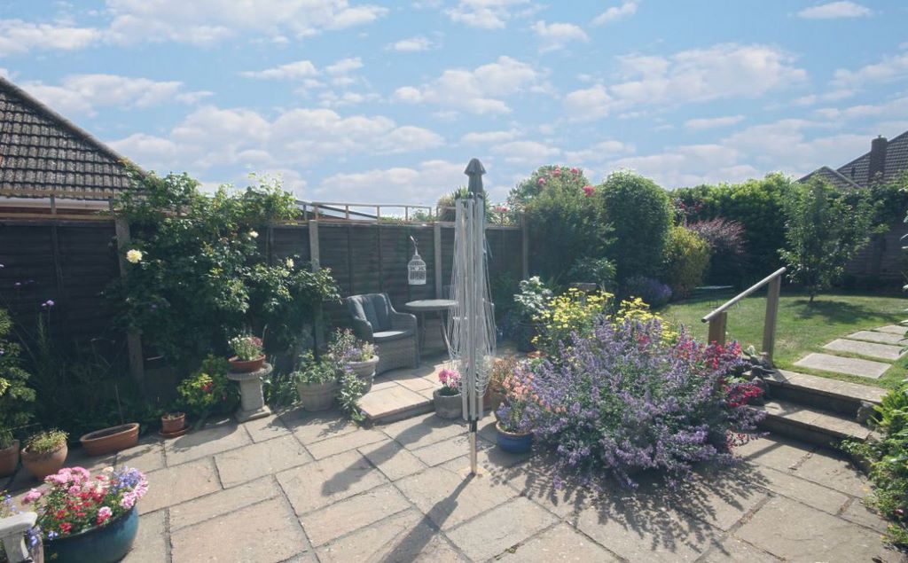 TO REAR: Southerly facing. Laid to lawn. Patio area. Garden shed.